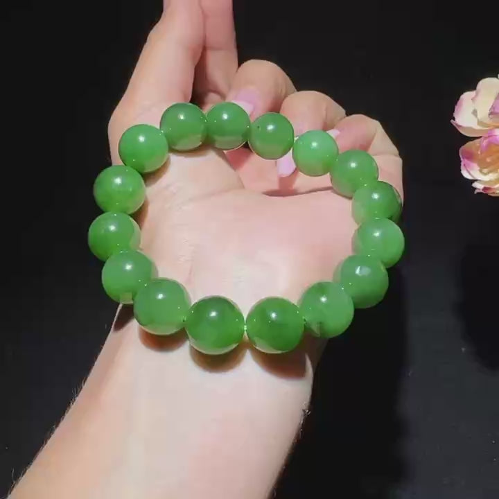 颜色阳绿色,色泽均匀, 饱满大气,油性十足, 密度高,无棉,玉质细腻,均匀自然,过眼过灯,油油糯糯,有少许矿点,不影响整体效果。共有两条
