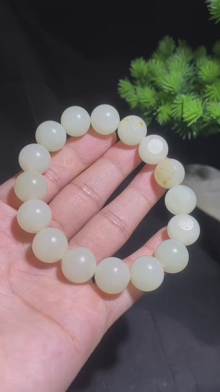 玉质温润如凝脂,细腻油润,精光内蕴,仅留两颗原石毛孔,彰显籽料天然本真。寓意:老型珠寓岁月沉淀,毛孔藏自然灵韵,金镶纳福聚财,佩戴祈愿平安顺遂、福泽绵长。