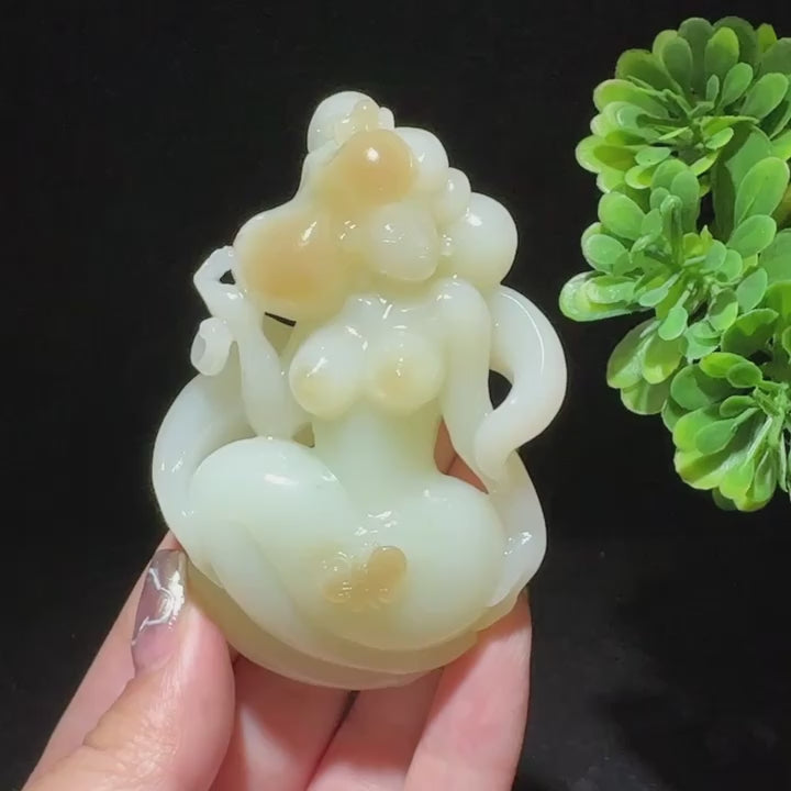采用新疆且末县产的糖白玉设计雕刻,淡淡的一抹糖色老熟自然,利用白肉巧雕一位美女,线条流畅,栩栩如生,实物非常的亮眼,窈窕美女,君子好逑,肉质温润细腻,油性十足,苏州工艺,雕工精美,糖色均匀自然,无杂无裂,润度极佳,非常有特色的一个产品。尺寸:82.7*54.6*23.8