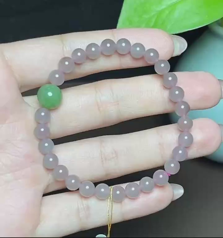 漂亮的紫罗兰玉色,料子老熟,底子干净,玉色均匀,颗颗珠子都是经过匠人精心打磨挑选,无纹无裂无杂,品相完美无暇,搭配一颗碧玉,实物更漂亮,使人爱不释手,玉质细腻油润,收藏传承级!寓意:圆满成功,事业圆满,平安幸福!