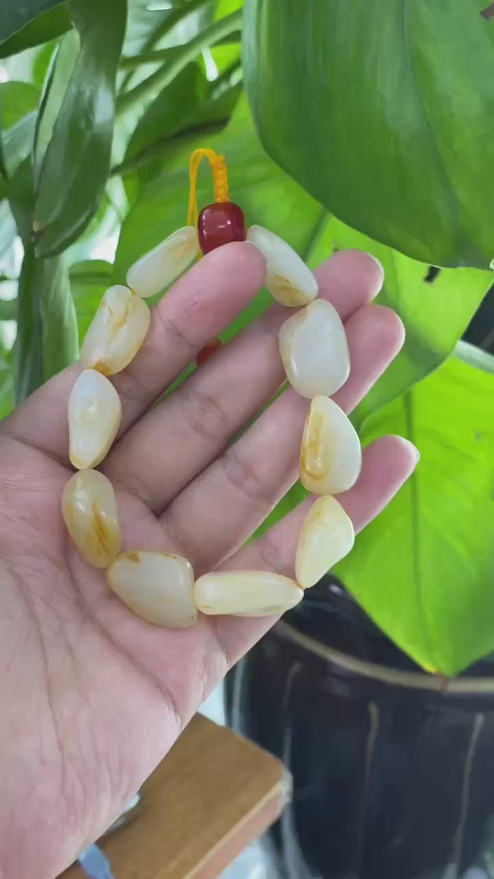 肉质细腻温润,干净无棉,油性十足,籽型饱满,手串的整体设计很独特,造型精美大方,展现出一种优雅而高贵的气质,适合各种场合佩戴,微修。