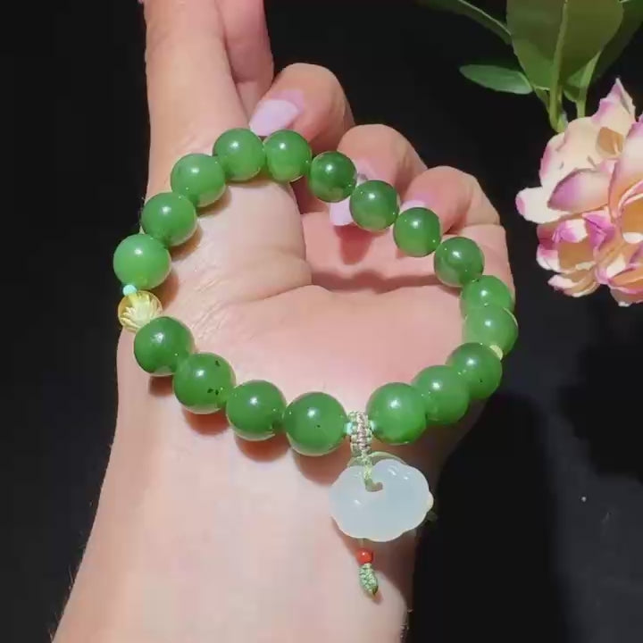 料子温润细腻,无杂无裂,颜色菠菜绿色,莹莹绿绿,均匀一致,油油润润,颗颗饱满,颗颗精选,配有白玉纯手工雕刻的宝宝锁作为配置,上手效果非常漂亮,珠子带有少许黑点,天然玉石属于正常现象。尺寸:9.5