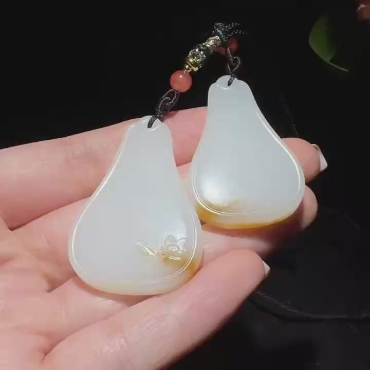 底部带有 一抹红糖,非常漂亮,糖白分明,玉质细腻,白度一级白,红糖白肉,油性十足,过眼过灯,纯净无暇,糖白融合完美,无水线无杂质,无棉无裂,牌型新颖,似一个瓶子,意在平平安安,佩戴高端大气,谓之无事,寓意平平安安,万事如意。共有一对尺寸:44.8*30*7