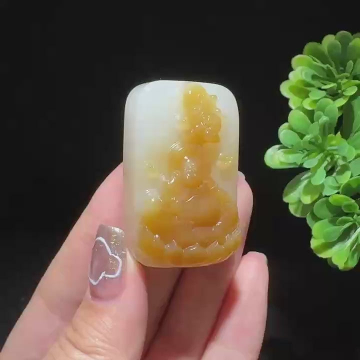 采用新疆且末金山矿的料子制作,料子干净细腻,油性十足,白度非常高,无杂无裂,密度高,牌型规整大气,方方正正,正面留有天然糖色,红糖白肉,超级漂亮,利用糖色巧雕一款财神和佛公,做工精致,惟妙惟肖,慈眉善目,喜笑颜开,寓意着财富双收,财富一生,平安无事。